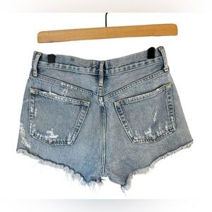 These are classic Y2K distressed denim shorts by Agolde. They have a button fly and 5 pocket design.