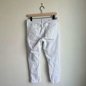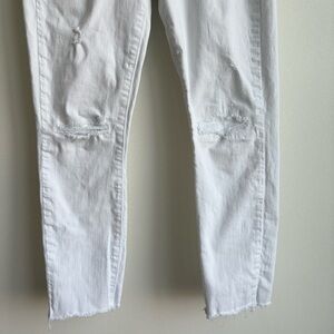 White skinny fit jeans with distressing and raw hem. Cropped ankle fit with high rise.