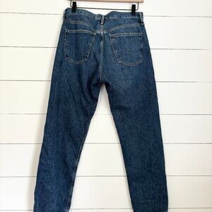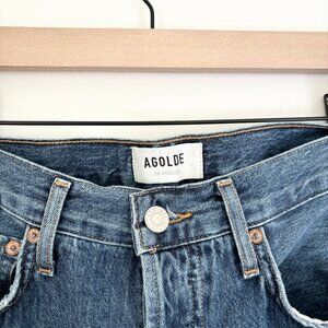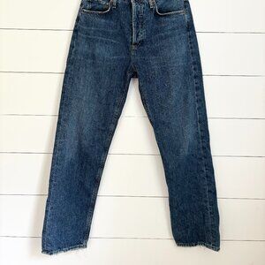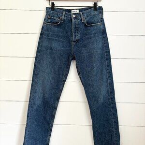 Agolde straight leg, high rise, dark wash jeans. These are a really expensive brand and great quality. The perfect everyday jean. Has button for closure on front. Slight fraying at the bottom of the jeans. Excellent condition, size 24.