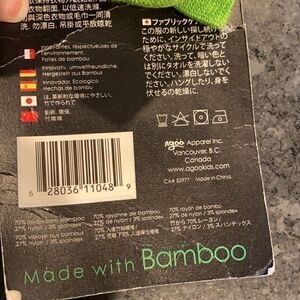 Set of two leg warmers from the Canadian company Agoo kids. They have shuttered their business, sadly. The cardboard packaging is a bit beaten up but the legwarmers are perfect. Made with bamboo