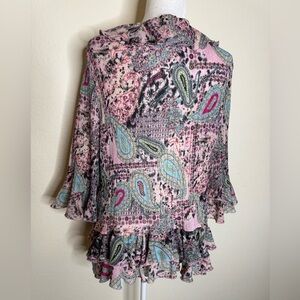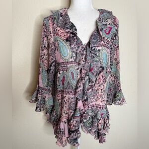 Agora Multicolored Ruffle Long Sleeve Blouse Whimsical Feminine Paisley Print 1X