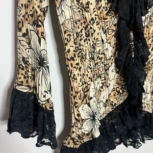 Agora Y2K Mob Wife Leopard Lace Ruffle Button Front Floral Hibiscus Blouse Large