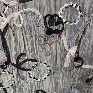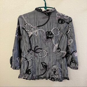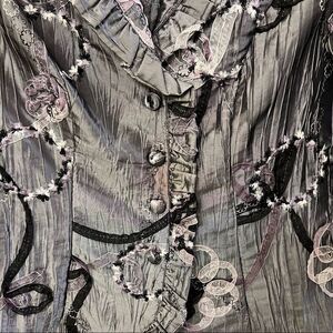 This fun graphic jacket is from Agora. The item is covered with decorative embroidery. The jacket is made of 55% polyester and 45% nylon. The size is small. The measurements are 23” L x 18” W (pit to pit) x 17” sleeve (shoulder to cuff). This jacket has been preowned but is in very good condition.