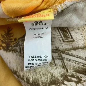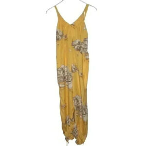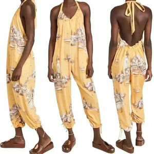 This silky and slouchy Agua Bendita jumpsuit features a charming shade of yellow, and is distinguished by a unique lighthouse print and an elegant halter neckline and open back.