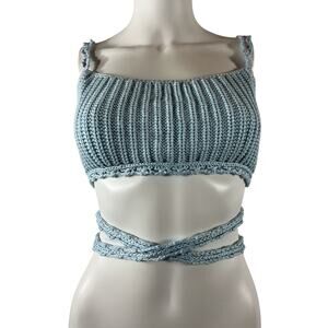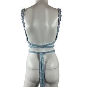 Agua Bendita 'Albany' Blue Acrylic Crochet Top Size S: wraparound styling with back tie, floral design on straps, measurements: 15.5 inch bust x 11 inch length.