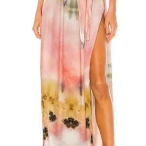 Never worn. The Amaia skirt by Columbian designer brand- Agua Bendita. Hand wash cold. Unlined. Elasticized waist with tie accent. Side seam slits. Skirt measures approx 114 cm in length. Made in Colombia. Color: pink