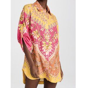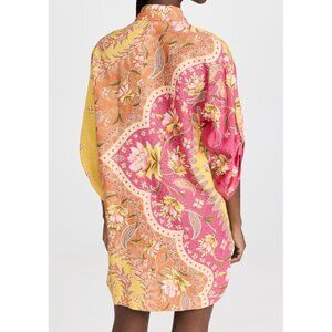 Agua Bendita 'Chrissy Lula' cover-up tunic shirt featuring a vivid mixed-print, roll-tab sleeves and a high-low hemline.