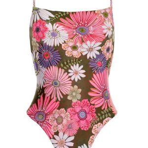 Stylish one-piece with vibrant floral design. Features pink, white, and brown hues. Perfect for beach days.