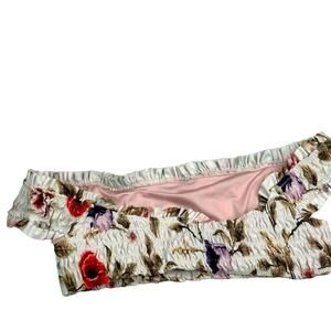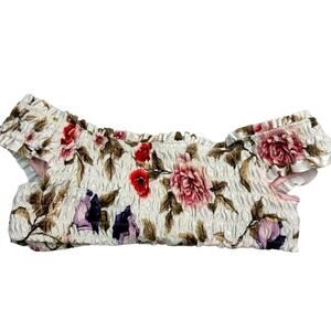 Item in Excellent Preowned Condition. Fully lined, Ruffled Detailing, Off the Shoulder, Rose print, Bandeau back. Measurements taken laying Flat: