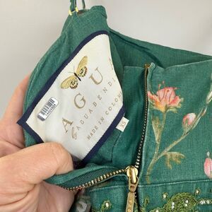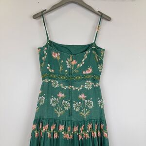 Elegant green maxi dress with floral patterns. Features a square neckline and tiered skirt. Perfect for any occasion.