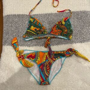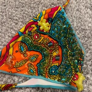 Vibrant paisley print beaded bikini. Features orange, blue, and yellow hues. Triangle top with tie closure. Matching bottoms with side ties. Never worn. Just sitting around for a while! Smoke and pet free home.