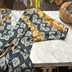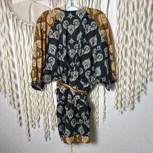 Zip and wrap style waist, buttons at cuff, raglan dolman sleeve, deep v neckline
