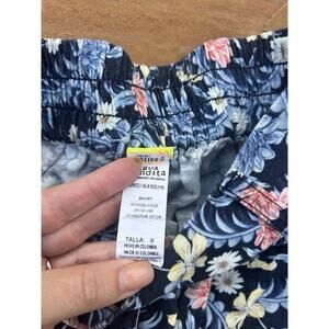 The Anthropologie Agua Bendita Nalia Shorts in a blue floral pattern are a stylish addition to any woman's wardrobe. Made of a linen blend fabric with a medium wash, these shorts feature a belted waist and are perfect for various occasions such as travel, parties, or casual outings. The medium size and regular fit make them comfortable and flattering for everyday wear. The floral theme adds a touch of femininity, making these shorts a versatile and chic choice for the modern woman.