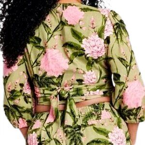 Agua Bendita Peony Print Linen-Blend Tie Wrap Crop Top Green Pink M Floral Wrap