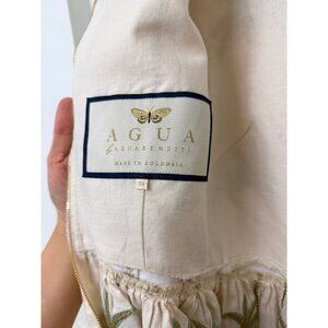 This Agua by Agua Bendita Raquel Maxi Dress is in great condition! Features a green palm tree / floral embroidery on an ivory white background (embroidered). Linen (no fabric tag), long maxi length, 3/4 length sleeves (puff sleeves), round neckline. The lining on the skirt has been removed (the bodice is still lined). A small hole on an underarm was repaired.