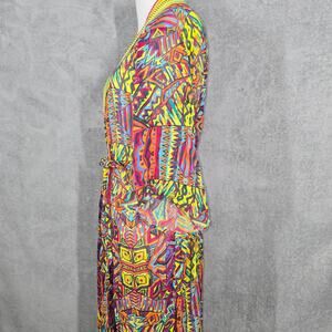 Colorful tunic dress. Long tunic style, printed silk, open front, strap to close at waist
