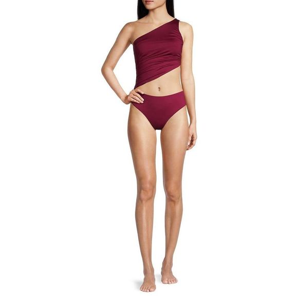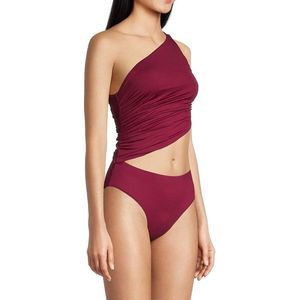 From the Luckiest Collection. This one-piece swimsuit features an asymmetric neck and cut-out waist.