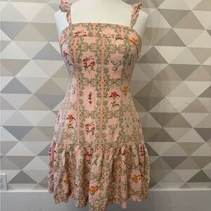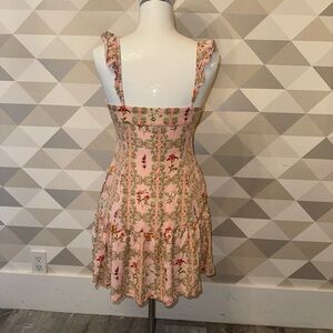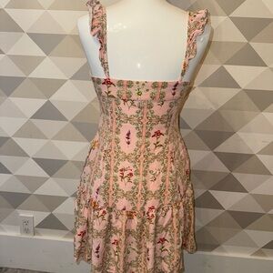 This sleeveless mini sundress features a playful ruffled and tiered design, perfect for casual or resort wear. The square neckline adds a touch of elegance, while the vibrant pink with red flowers make it a standout piece for any sunny day.