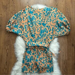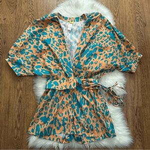 Agua Bendita Orange Green Romper Size Medium. Excellent preowned condition. V neck, sexy side pockets, medium length sleeves, waist tie, summer wear, beach wear, unlined.