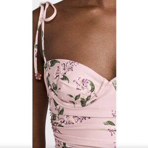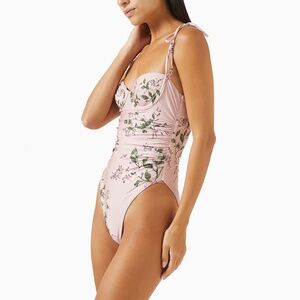 Agua by Agua Bendita Rabano Wisteria one-piece ruched swimsuit featuring sweetheart neck, underwire cups and adjustable tie straps. Comes with matching Wisteria cotton and silk blend pareo / sarong that ties at the waist.
