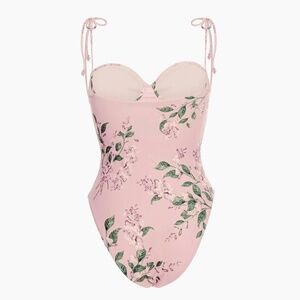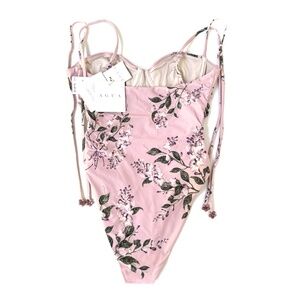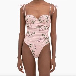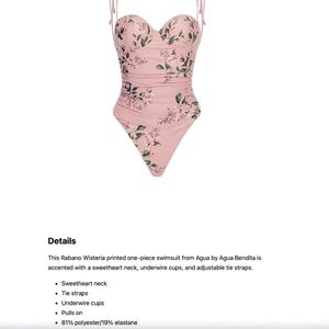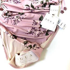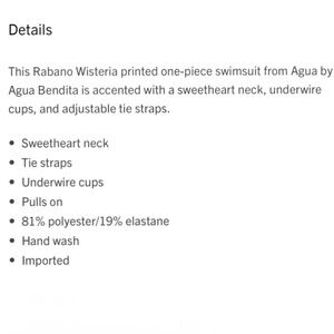 Agua by Agua Bendita Rabano Wisteria one-piece ruched swimsuit featuring sweetheart neck, underwire cups and adjustable tie straps. Comes with matching Wisteria cotton and silk blend pareo / sarong that ties at the waist.