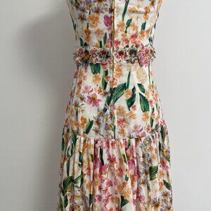 Fabric: 100% linen. Lining: 100% cotton. Made in Colombia. Machine washable. Fully lined. Hidden back zipper closure. Texturized 3D floral panels all over. Elastic shoulder straps. Linen with lace trim at the hem.