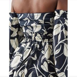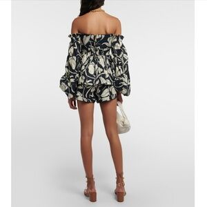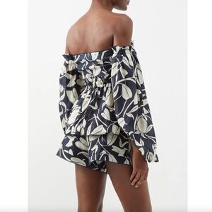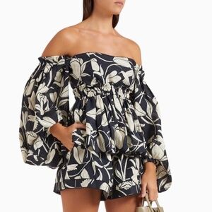 New with tags Agua by Agua Bendita high waisted Toronjil Shorts with elastic waist band in size M (retail $310) made from lightweight linen with 100% cotton lining and the matching Jamaica off-the-shoulder peplum top (retail $410) with exposed back zipper and ballon sleeves also new with tags in size M. The fabric is featuring a floral print scattered with hummingbirds