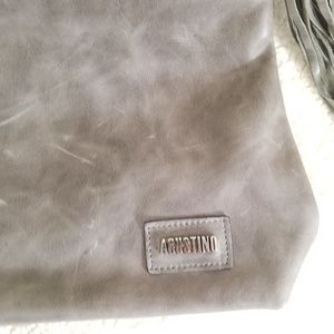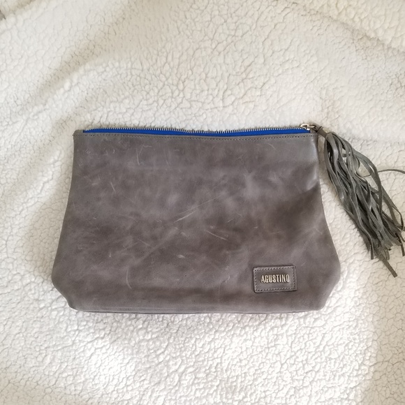 I purchased this clutch while in Buenos Aires Argentina. It is a new gray leather clutch with a blue zippered closure on top and fringe pull. Leather does. The leather does have natural marks/scratches on the leather...see the last picture.