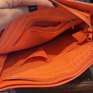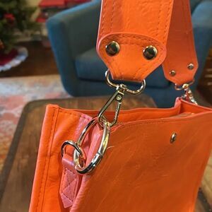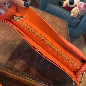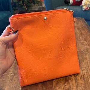 Super cute vegan leather shoulder bag in the brightest orange with gold hardware!