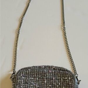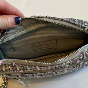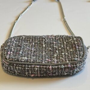 Cute tweed pattern. Lots of pastels and grays. Silver hardware