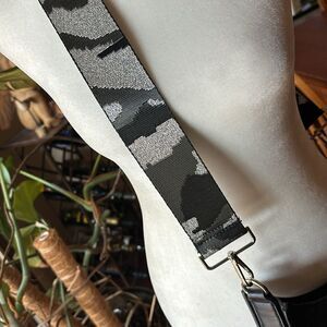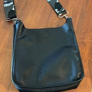 Ahdorned Black Messenger Bag. In like new condition. Bag has detachable strap, made of faux leather. Measures approximately: 11”x11.5”x3”. Grey Camo - 2 inch guitar strap included.
