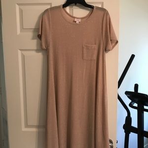 Carly size medium. It's a shimmery tan and super adorable on. I wore it once for a few hours on Easter. Great to throw on and dress up or dress down.