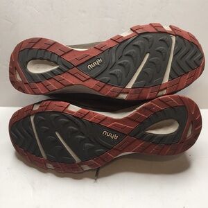 Ahnu Sugar Venture Gray and Brown Suede Leather Low Top Sneakers Size 9 Brown and gray suede lace up Very good condition Light signs of wear No rips or tears. Made from waterproof leather Made-in-USA water-resistant canvas liner fabric, Polyurethane insoles and spider rubber outsoles for great grip and balance.