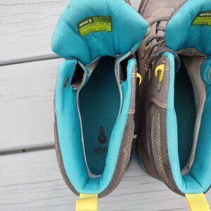 Gently used Ahnu hiking boots are waterproof with a Vibram sole, leather uppers and a textile lining. US Size 11. Gray, turquoise interior and yellow details. See photos.