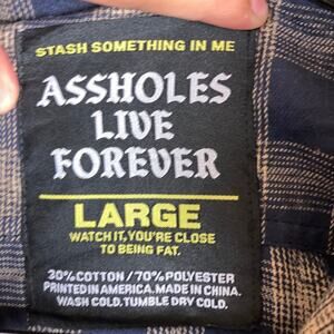 A$$holes Live Fovrever Mens Shirt Navy Beige Plaid Button Down Cotton Blend L