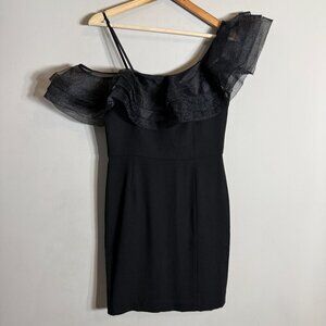 Aidan Mattox Asymmetric Ruffle Bodycon Cocktail Mini Dress Womens 6 Black Tulle