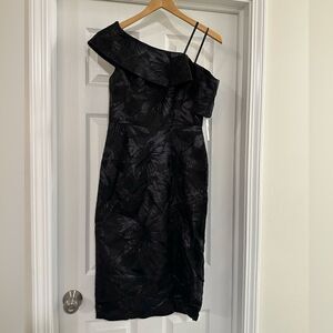 Fits true to size, order your normal size • Fitted through bust, waist and hips • Non-stretch fabric • Designed to hit at the knees • Asymmetric neckline • Asymmetric popover detail at bust with cap sleeves, off-the-shoulder at left • Strapless-bra-friendly • Front and back shaping seams • Seamed waist • Pleated ruching at waist • Offset front slit • Concealed back zip with hook-and-eye closure • Allover floral jacquard weave • Lined • 50% acetate/30% polyester/20% polyamide; lining: 96% polyester/4% elastane • Dry clean • Imported • Color: Black • MSRP $350