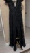 This exquisite black gown by Aidan Mattox is perfect for weddings and formal events. It features a dramatic plunge neckline and delicate cap flutter sleeves, adding a touch of elegance. The full-length maxi design flows gracefully, making it a standout choice for any special occasion.
