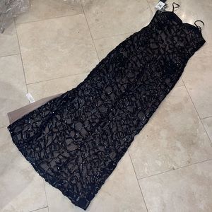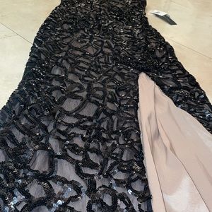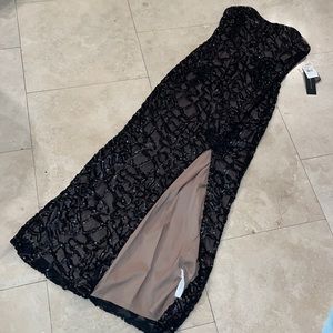 Elegant strapless dress with intricate black sequin design. Features a stylish slit for added flair. Worn once for a few hours, stunning dress.