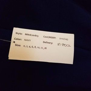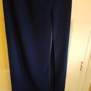Striking navy column gown in crepe with off the shoulder arm cuffs attached and cutout detail at bust. The stunning slit will show some leg, while still remaining classy and sleek. Center back zip.