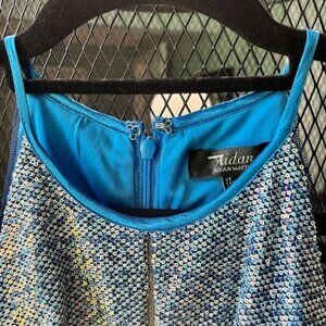 Aidan Mattox iridescent sequined party dress. Halter neckline. Cut-in shoulders