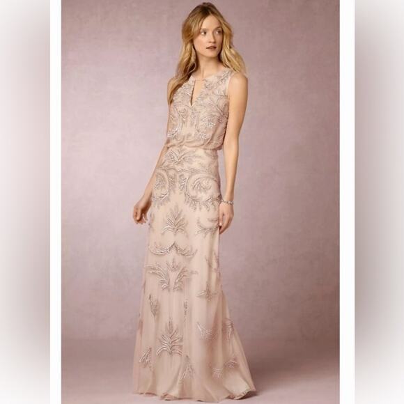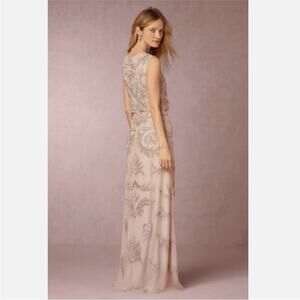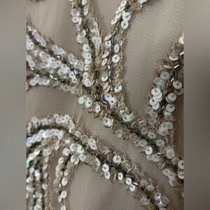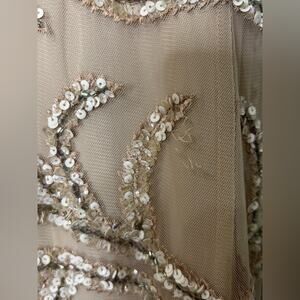 Very good condition. Size 4. Gorgeous nude color formal gown. Maxi length. Keyhole at neckline. Nude mesh overlay with ornate sequins and beadwork in white and silver. Blouson bodice. Slight flare to skirt. One spot on back where the silver beads have come off, see pic. It’s to the side of the back right side, A couple inches long, not terrible conspicuous.