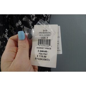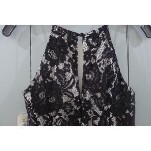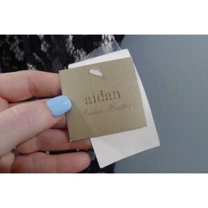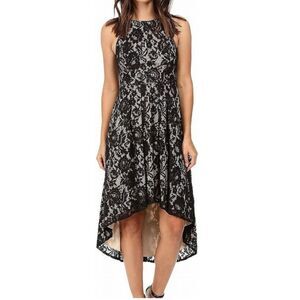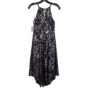 Aidan Mattox Lace Hi Lo Dress - Black Ivory 2. This item is new with tags attached. Measures flat approximately 15.5" across the chest, 37.5" long in the front and 49" long in the back.