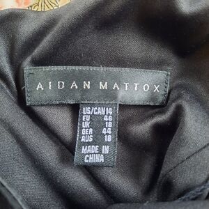 🛍 Aidan Mattox Metallic Gold Floral Jacquard Maxi Evening Gown Size 14. Pull-on style dress with hidden back zipper closure, wide straps, contouring chest seams, band empire waist, full gold metallic floral skirt, under skirt tulle, fully lined, and maxi floor length. In excellent condition, worn once! 100% viscose bodice, 86% polyester 12% metallic 2% elastane skirt shell, 100% polyester bodice lining, 100% acetate skirt lining. Size 14.