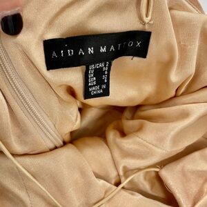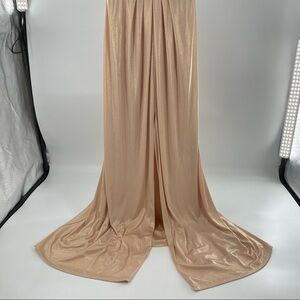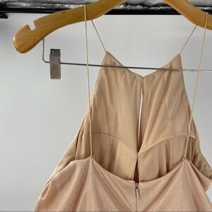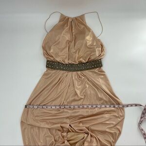 Aidan Mattox Metallic Halter Beaded Maxi Length Formal Gown Dress. Metallic gold in color. Dress is stunning in long flowing fit with empire beaded waistband. Front has a keyhole opening and dainty spaghetti straps with an open back. Side slit from knee down. Fully lined with built in bra.