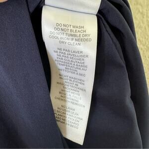 Excellent used condition! Navy blue fitted midi dress. Large exaggerated ruffles across chest in an off the shoulder look. Draped front and back zip closure. Imagine as a wedding guest dress, mother of the bride, mother of the groom or special occasion dress.