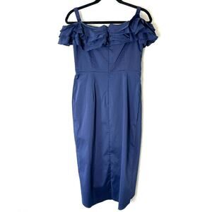 Excellent used condition! Navy blue fitted midi dress. Large exaggerated ruffles across chest in an off the shoulder look. Draped front and back zip closure. Imagine as a wedding guest dress, mother of the bride, mother of the groom or special occasion dress.