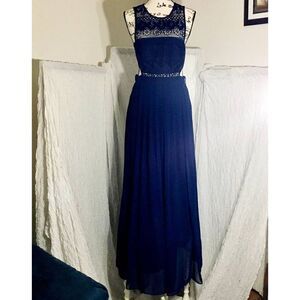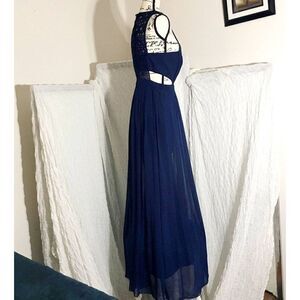 Long, lace cut-out, sleeveless, evening/formal dress. Pleated flowy bottom. Lined and built-in bra included. Pre-owned in great condition .Please refer to pictures for best description and condition verification.