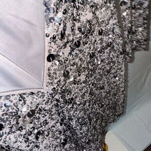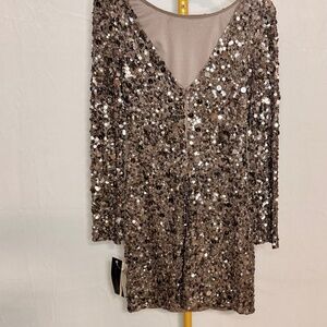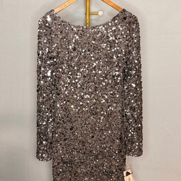 Absolutely stunning Aidan Mattox sequin mini dress — brand new with tags. Fully embellished in metallic silver/grey sequins with a flattering V-back and long sleeves. The perfect statement dress for holiday parties, NYE, weddings, events, or photos.