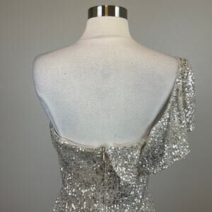 Aidan Mattox Sequined One Shoulder Ruffled Sheath Cocktail Dress Silver Size 12